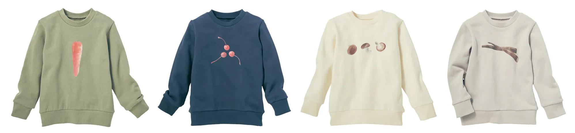 スウェットシャツは、「ママも子供もみんな知っているあの歌を題材にしてみたい」という、よこみねさんのアイデアから誕生しました。子どもと一緒に「食」について楽しく話しをするきっかけになるよう描いたイラストは、にんじん・さくらんぼ・しいたけ・ごぼうのお弁当をモチーフにした絵柄で、鮮やかな転写プリントでシンプルに際立たせました。