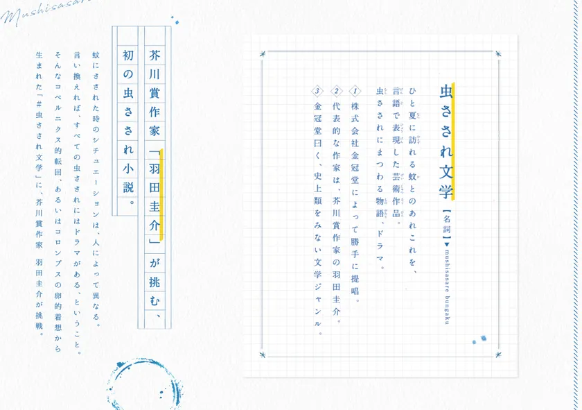 また、公開にあわせて羽田さんから頂いたお題を元に、虫さされにまつわる小説を一般募集するキャンペーン『#虫さされSNS文学賞』を実施いたします。優秀作品には「羽田さん直筆サイン本」と未来の文学賞を狙ってもらうための「#虫さされ文学専用 オリジナル原稿用紙」をプレゼントいたします。