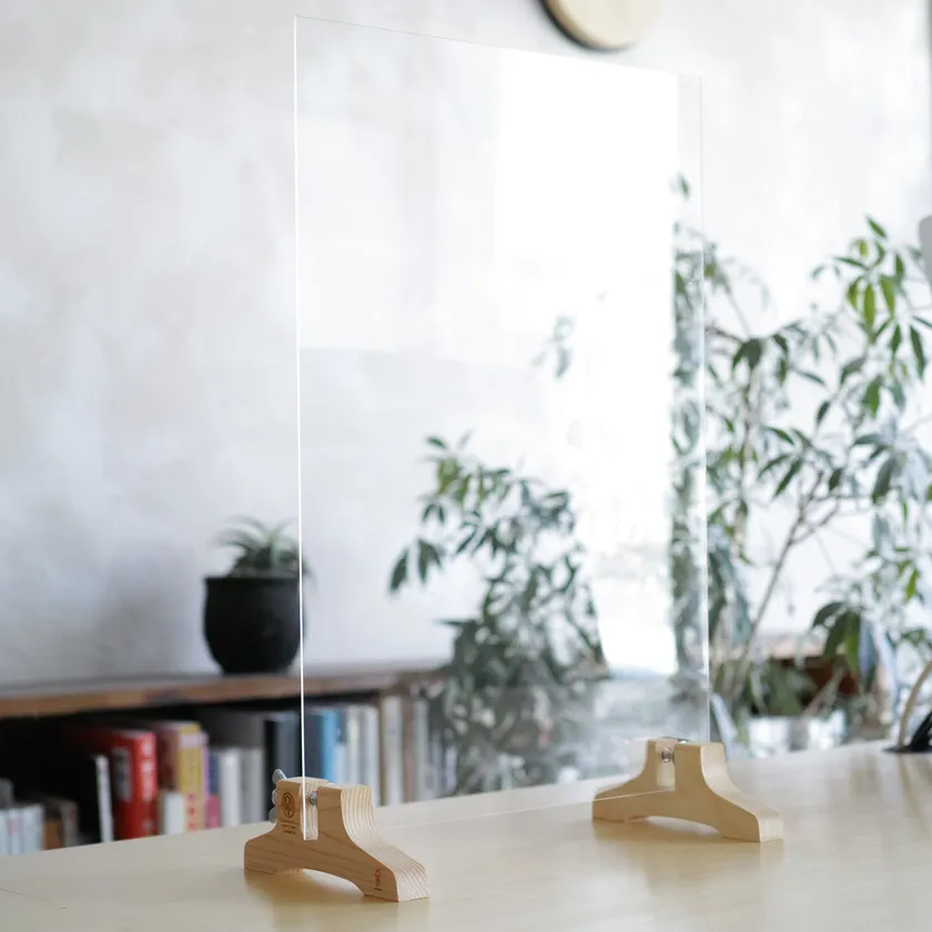 オンラインストアでは複数サイズのアクリル板も用意しますが、お客さまご自身が板を用意することも推奨しており、簡単かつローコストでオリジナルのパーテーションを作ることができます。また、台座と板は簡単に着脱可能なため、コンパクトに収納することや、板材を別用途へ転用することも可能です。