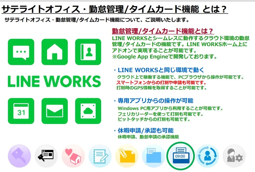 サテライトオフィスは、LINE WORKS 導入支援の中で、LINE WORKS で利用可能なシングルサインオン機能、ワークフロー機能、掲示板/回覧板機能、ドキュメント管理機能、CRM機能、タイムカード/勤怠管理機能、安否確認機能等を無償/有償提供しております。