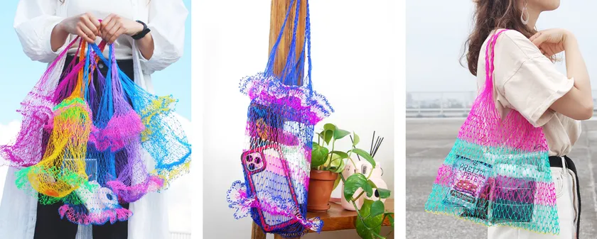 夏っぽい透け感が爽やかなビタミンカラーが特徴の網バッグは、持つ人だけでなく見る人の気分も上げてくれます。周囲も笑顔にするカラフルな個性派網バッグで、世の中の一人でも多くの人を明るく笑顔にしたいと考えております。