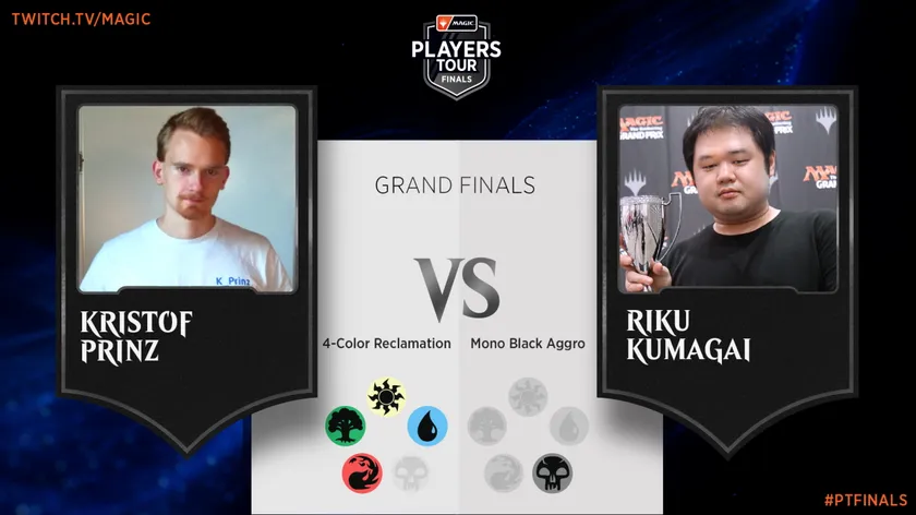 環境最強と謳われるティムール再生デッキの強みを残しつつそれを倒すべく誕生した「4色再生」デッキを使うプリンツ選手と、ティムール再生デッキが苦手とするクリーチャー(戦闘を行う生物カード)をこれでもかと詰め込んだ高速デッキ「黒単アグロ」を使う熊谷選手。奇しくも互いに最強デッキへの回答とも言えるデッキの使用者同士がぶつかる形となりました。