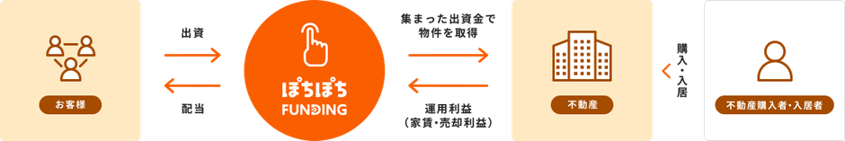 投資家の皆様から資金を集め、集めた資金で不動産を取得し、運用することで得られた利益の一部を、皆様に配当として還元致します。