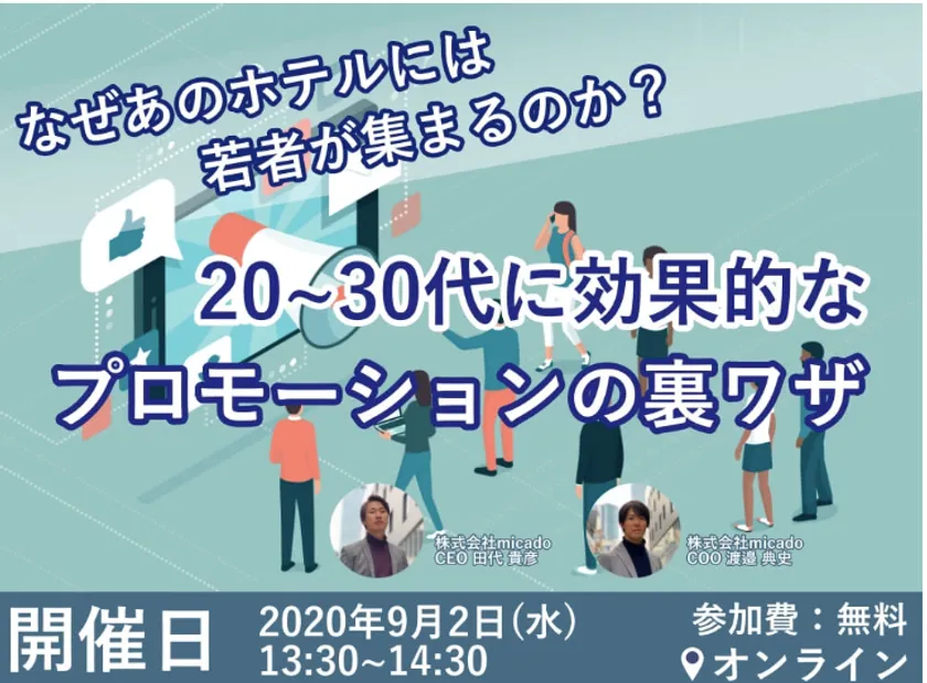 「ホテル・旅館のWeb集客支援」を行っている株式会社micadoが565社以上の企業と一緒に仕事をしてきたノウハウを基に、定期的にセミナーを開催しています。Web集客やプロモーション戦略などをご担当される方はぜひチェックしてみてください!