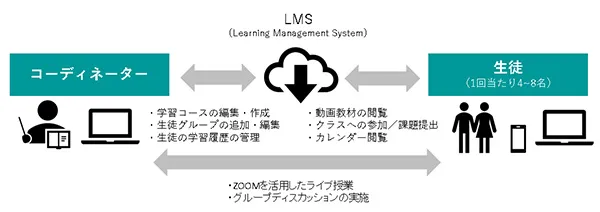 コーディネーターと生徒をオンライン会議システムでつないで授業を行います。動画などの教材や生徒向けの課題はLMS(Learning Management System)に保存されており、生徒はそれぞれ、各自のIDを活用して学習を進めることができます。