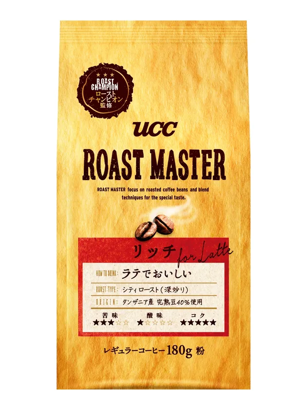 『UCC ROAST MASTER リッチ for LATTE』はタンザニア産の完熟豆40%を使用し、シティロースト(深炒り)にすることにより、甘味を帯びたコクが増しミルクとの相性が良い香ばしい香りとなり、ラテ飲用におすすめです。