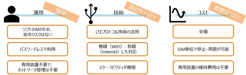 利用者は、ソフトSIMを端末にインストールして接続を行うため、紛失リスクがなく、パスワードレスでネットワークへ接続を行うことができます。また、クラウド型サービスのため、急な増減にも対応が可能となります。
