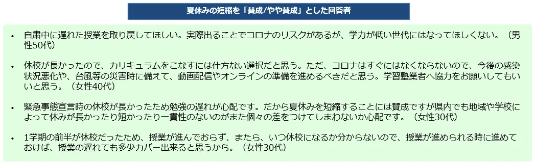 ●その理由には、長い休校によって勉強が遅れていることを心配しており、夏休みを短縮して遅れを取り戻して欲しいという意見が多く見られました。また今後のオンライン教育への期待の意見が見られました。
