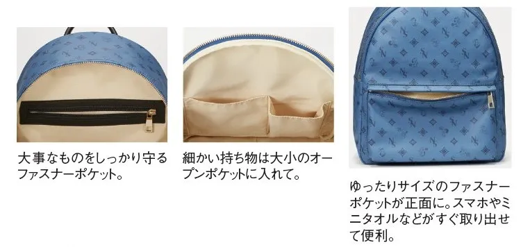 ゴルフにサッカーにテニス、アメフト、バスケといろんなスポーツを楽しむスヌーピーが、かわいい足あとマークや四つ葉のクローバーとともに、さりげなくデザインされているタウンリュック。