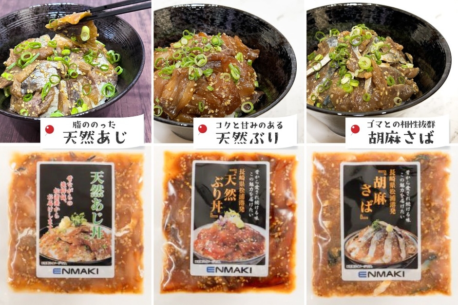 天然あじ・天然ぶり・胡麻さばを、ごまと特製醤油で漬け込んだ逸品。