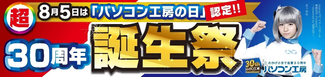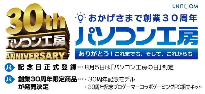 おかげさまで株式会社ユニットコムは 創業30周年! ありがとう!これまでも、そして、これからも! 8月5日「パソコン工房の日」記念日正式登録が決定! 感謝の気持ちを込めて創業30周年 限定商品発売!