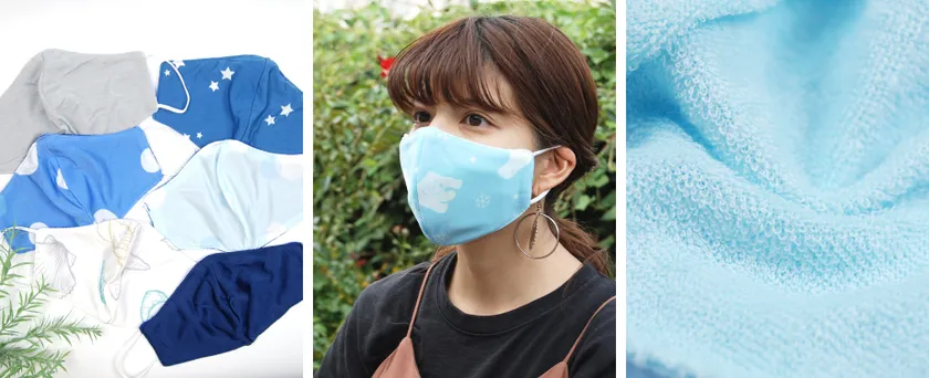 裏地にはふんわり優しい肌触りのパイル生地を使用しています。独特の柔らかい触感と通気性の良さが特長で、暑い時期のムレ抑制の効果も期待できます。また、マスクはリバーシブルの使用が可能となっていますので、TPOに応じた使い分けがお楽しみいただけます。