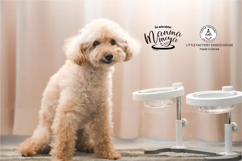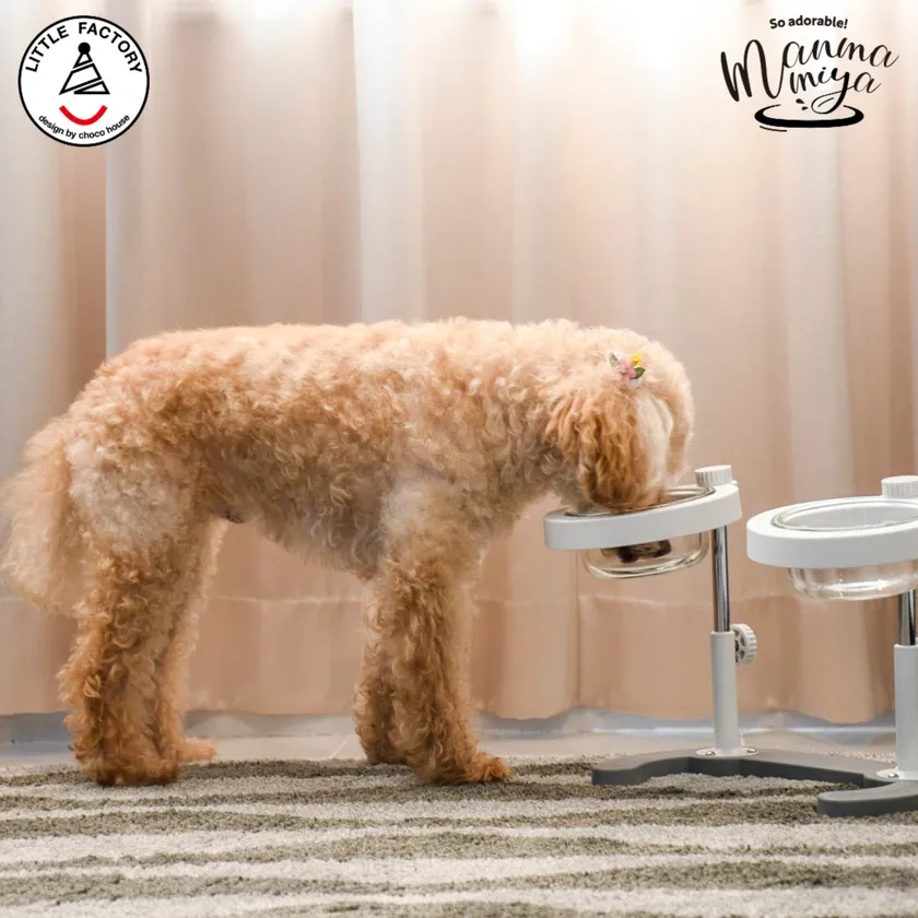 ・ボストンは、ボウルに顔を突っ込んで食べるから、フードが外に飛び出ていたんです。マンマミーヤは食器の周りが樹脂で保護されているから、フードが飛び出ず清潔ですね。うちはボストン二頭いるので、ダブルミーヤの高さと角度を調節して、並んで仲良く食べてますよ。(神戸市 M.E様)