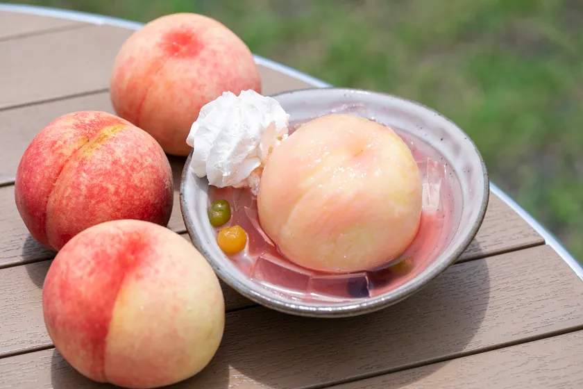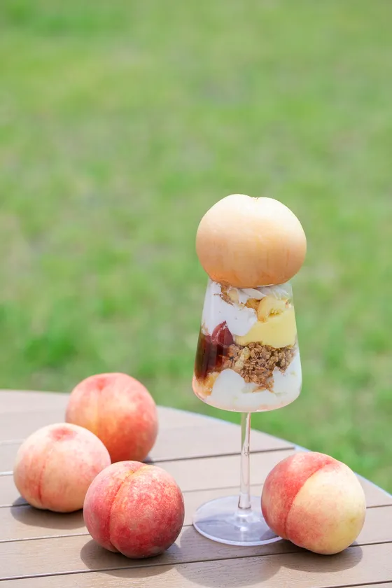 旬を迎えた山梨の桃をまるごと!新感覚スイーツを味わう! 白桃をまるごと乗せた「もももパフェ」と様々な桃スイーツを 『道の駅なんぶ 南部よろこび茶食堂』で8月8日(土)に販売開始