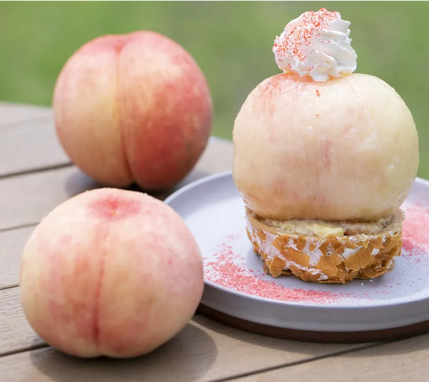 ももまるごと10個を使用!中にはジューシーな白桃と相性の良いスイーツをいっぱい詰め込んだ夢のようなスイーツに仕上げました。