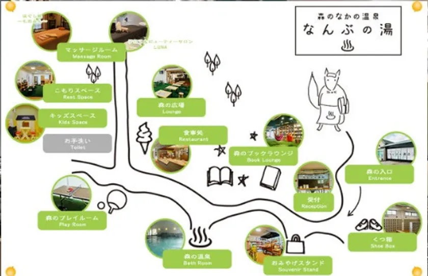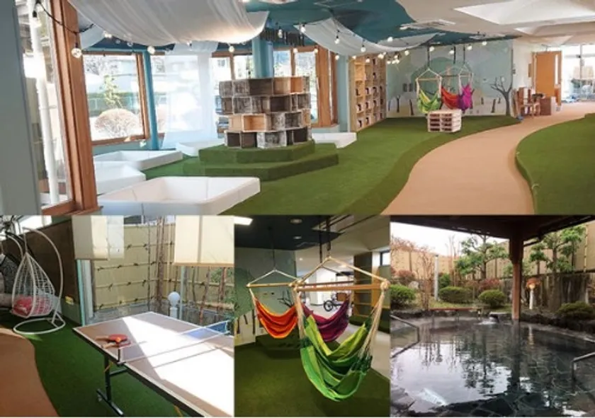 「森の温泉」をコンセプトに、森の中を探検するワクワク感と森林の癒しをイメージした可愛らしい空間へ内外装を昨年末に大幅リニューアル。最大の特徴である温泉はそのままに、新たに本格グルメを味わえる食事処や約8,000冊の漫画や本、雑誌を読書できる「ブックラウンジ」、そして自由におくつろぎいただけるスペースを多数設置。人生ゲームプラス令和版やカタン、クラッシュアイスゲームなど定番から最新まで約20種類のボードゲームもお楽しみいただけます。さらに、カウンターテーブルやWi-Fiも完備しておりますので、おひとり様からご家族連れまで、それぞれのライフスタイルに合った贅沢なリラックスタイムを満喫できる温泉施設に生まれ変わりました。