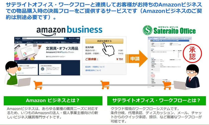 サテライトオフィス、 ワークフローと「Amazonビジネス」を連携(パンチアウト機能)、 物品購入の決裁フロー機能を無償で提供