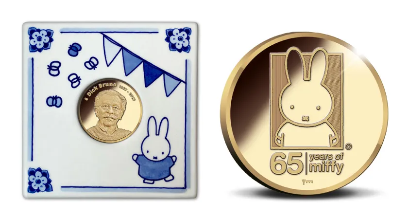 ラインナップは3種類。発行数わずか10枚の金メダル、750枚の銀メダル、さらに今年のオランダ2ユーロ貨と黄銅メダルのセット、計3種類となります。メダルの表面には、ディック・ブルーナの特徴的な肖像をデザイン。裏面には、可愛らしいミッフィーの姿とともに、「ミッフィー誕生65周年」のロゴが刻印されています。