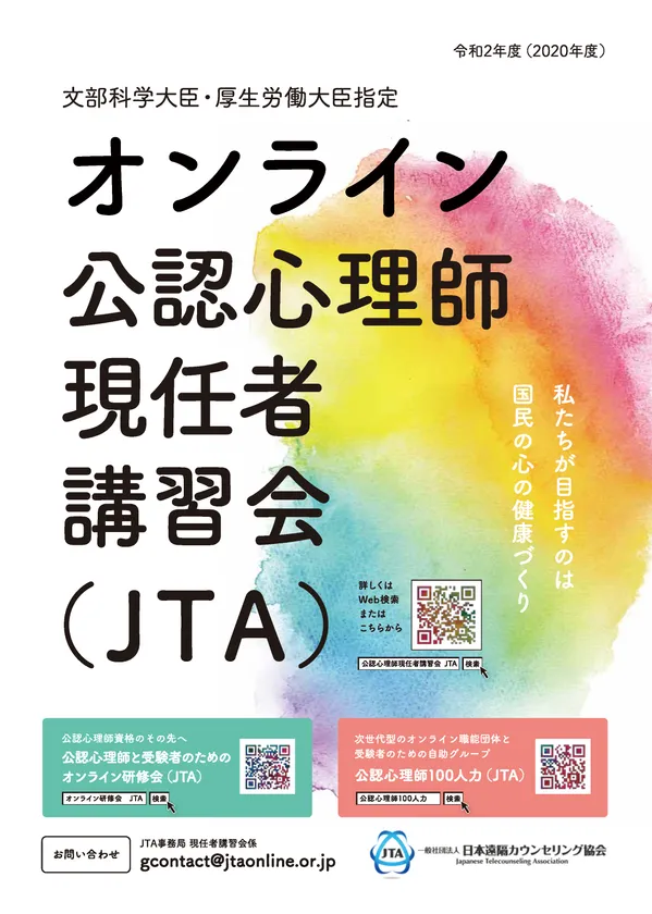 新型コロナウイルス感染症予防の特例措置! 文部科学大臣・厚生労働大臣指定 「公認心理師現任者講習会(JTA)」 8月と10月にオンラインにて開催