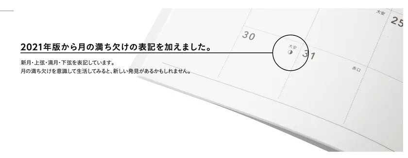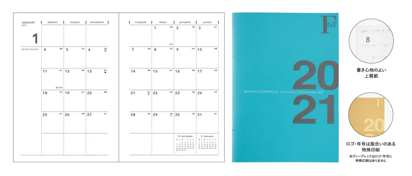 F.O.B COOP ダイアリーは、必要最小限の機能を1冊に凝縮した、薄型・軽量で持ち歩きに便利なノートタイプと、予定と一緒にノートや書類などをスマートに収納して持ち運べる機能的なカバーがついたハードカバータイプの2タイプがあります。2021年版から月の満ち欠けの表記を加えました。