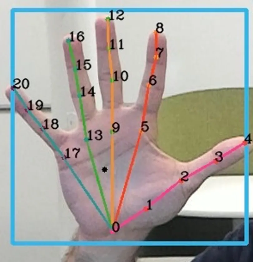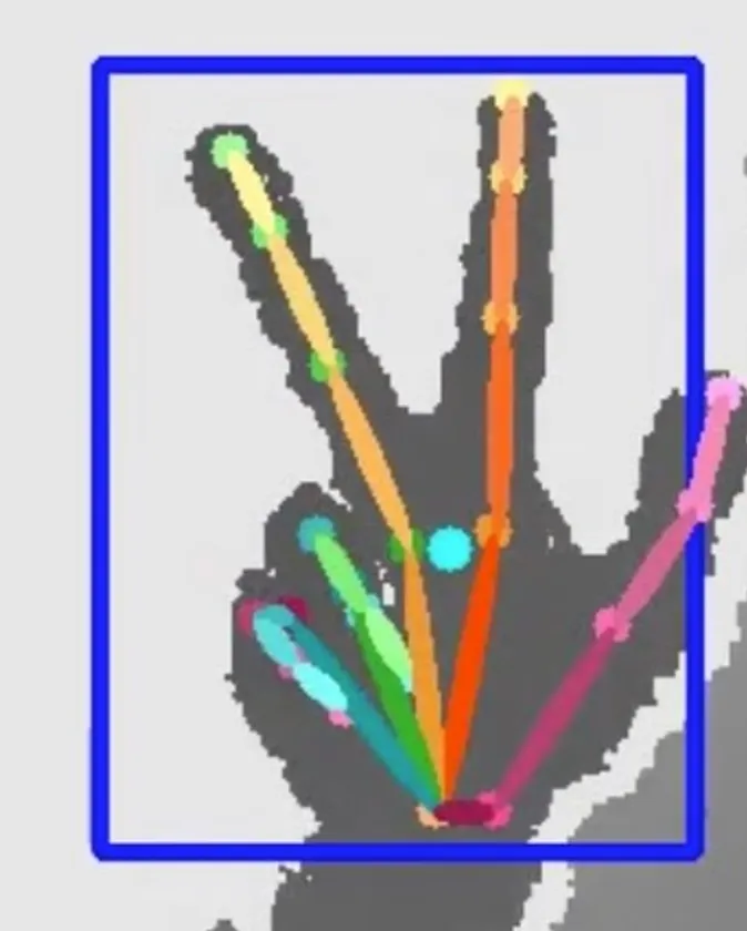 Motion Gesturesは、手の画像をBLOB*として扱う従来のソリューションとは異なり、カメラ映像を通じて21関節をベースとした骨格構造をそれぞれの手に割り付けます。全21関節の位置座標はリアルタイムで測位されます。この方法は4つの点で優位です。