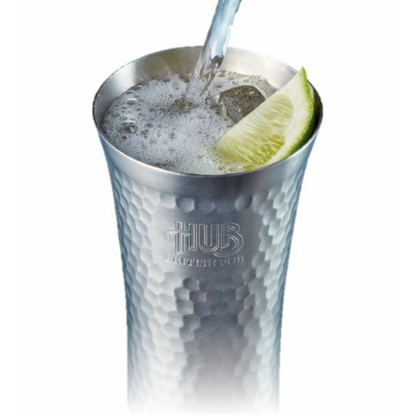 HUBの人気メニュー[ロンドンジントニック]に使用されるオリジナルタンブラー。食事・お酒商品の中で唯一ランクインのハブグッズ。冷たさが長続きするステンレス製なので、ハイボールやカクテルをずっと美味しく召し上がれます!
