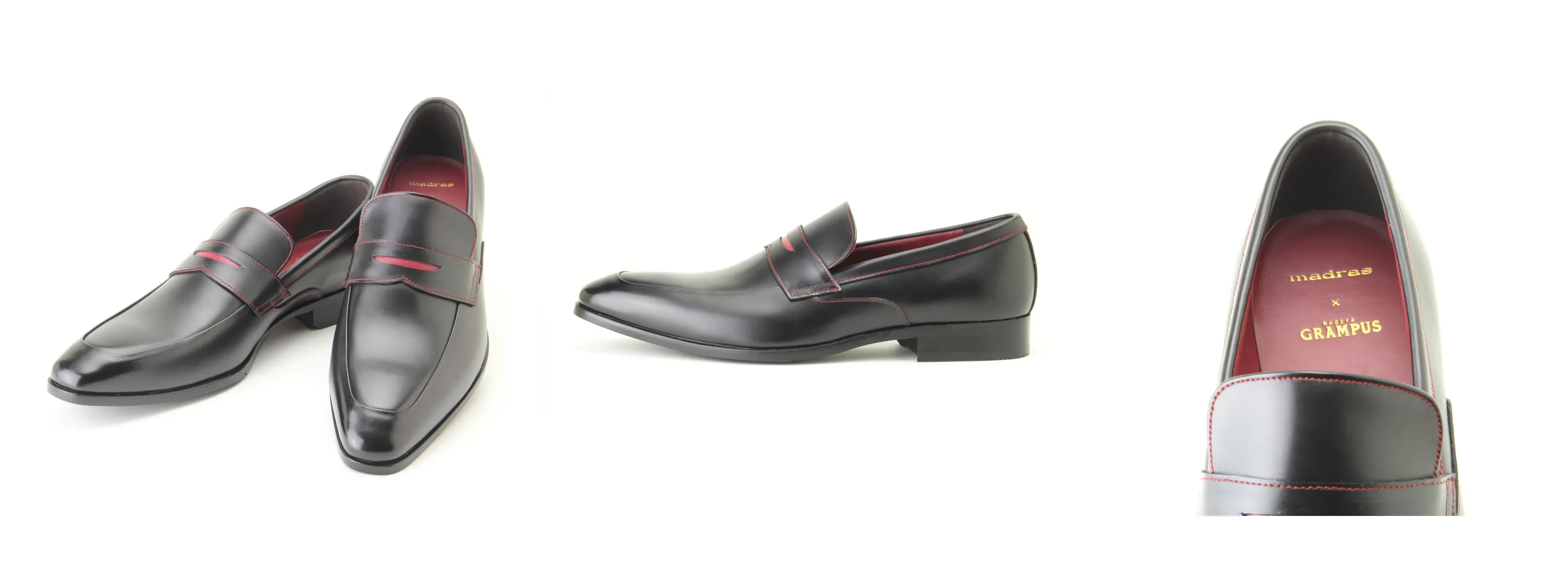 グランパスカラーの赤をアッパーとアウトソールのステッチ、アッパーのベルト部分にさりげなくあしらったスタイリッシュなローファー。