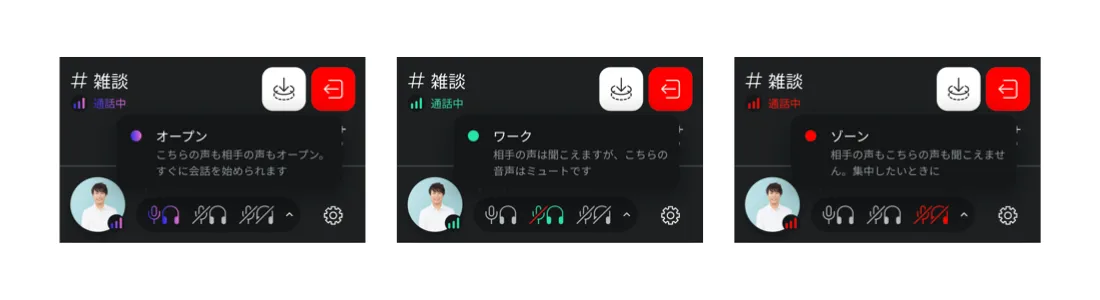モードはオープン/ワーク/ゾーンの3種類(※4)から選択可能で、作業に集中したいときは、会話できないモード(ゾーン)に切り替えることもできます。また、モードを変更し忘れることがないように、スピーカーとマイクのオン/オフ(ミュート)と連動し、自動で確実にモードを変更します。