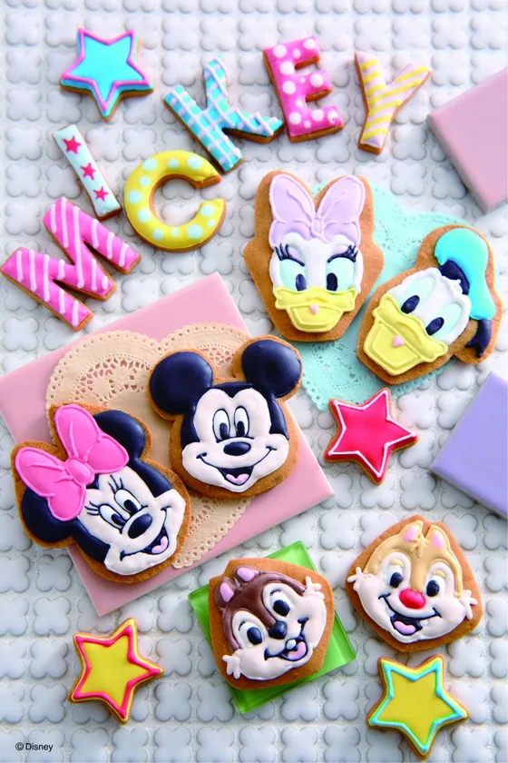 サクサクのクッキーを焼き、かわいいミッキーマウスとフレンズたちのお顔をアイシングでデコレーション。