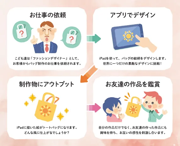 その第三弾として年少からを対象とした「プログラボクリエイターズ」を開講します。クリエイターの仕事をテーマに、タブレット端末で絵を描いたりアバターを作成しながら子ども達一人一人がオリジナルのバッグやクリアファイルなどを作る内容で、その目的は以下の3点です。