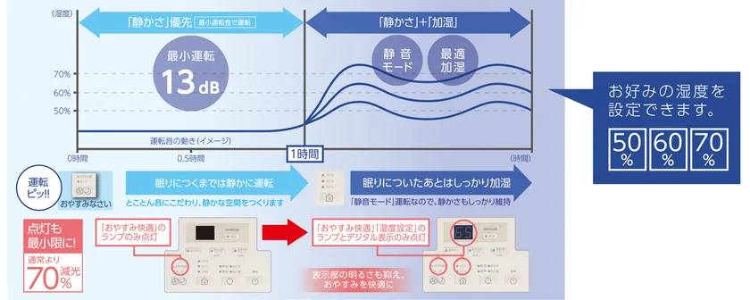 従来の「おやすみ加湿」では、静音モード運転時の設定湿度が50%から変更できませんでしたが、「おやすみ快適」では、50%、60%、70%からお好みの湿度を設定できます。
