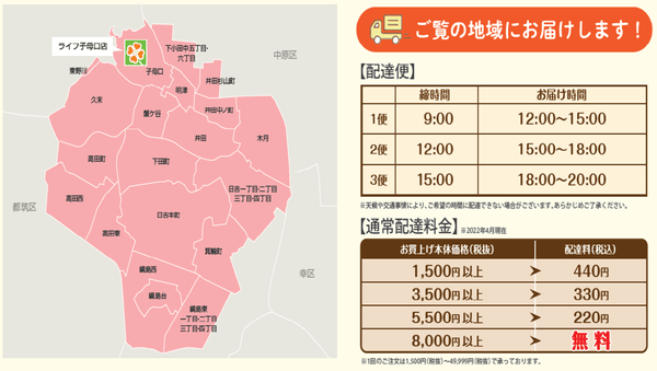 ライフ子母口店でのサービス開始により、当社のネットスーパー導入店舗は、89店舗(近畿圏54店舗・首都圏35店舗)となります。