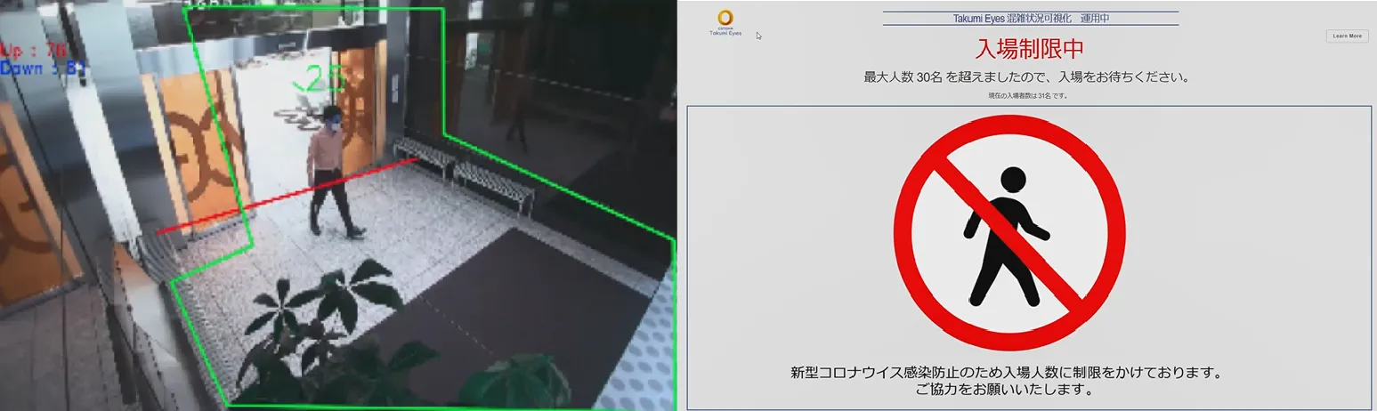 施設の入口付近に設置したカメラの映像から、人の出入り数をカウントし、施設内の滞在人数を把握します。滞在状況をモニタへ表示し、閾値を超えた場合は、警告文の表示やアラート音によって注意を促し、訪問者の入場を制限します。