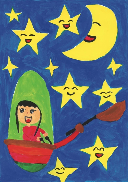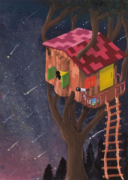 私の絵は、小さい頃から憧れであったツリーハウスとそこから見上げる星空の絵です。今でもこんな秘密基地のような場所で、星空を独り占めしたいと思うことがあります。