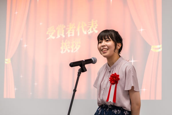 コロナ禍の影響で三年越しとはなってしまいましたがこのような形で式が行えたことを嬉しく思います。表彰式を開いていただきありがとうございました。この経験を糧にさらに前進していきたいです。