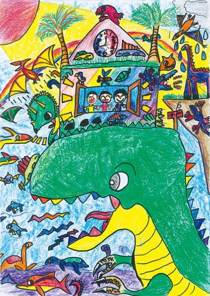 この家の下にいる恐竜はレインボーザウルスという名前で海や山につれて行ってくれ窓からは、毎日毎日ちがう景色が見えワクワクします。ぼくは、こんなすてきなお家が未来にある事を信じています。