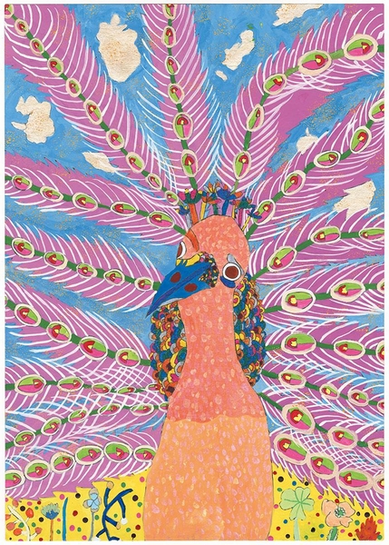 羽がとてもキレイなのでクジャクが大好きです。 クジャクがカラフルな羽を大きくいっぱいに広げているところを描きました。こっちを見て言葉を話しそうです。