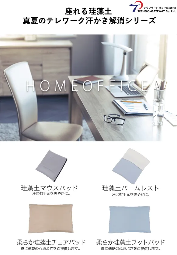 テクノゲートウェイ株式会社(本社:千葉県木更津市、代表取締役:早川 昇)は、酷暑の中、ニューノーマルでのライフスタイルに最適ラインナップとして、長時間のデスクワークでも蒸れを解消、爽やかにする「フワさら抗菌珪藻土チェアパッド」をはじめとする7製品「珪藻土マスクケース」「珪藻土ハンカチ」「ひや爽マスク」「珪藻土マウスパッド」「珪藻土パームレスト」「珪藻土フットパッド」を一般販売先行予約を8月20日(木)より開始いたします。