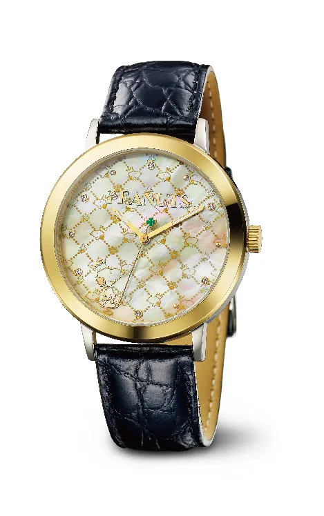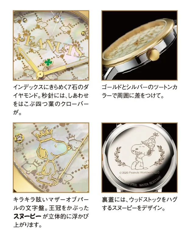 PEANUTS70周年を記念して、いくつものスヌーピーの思い出を映したマザーオブパールを文字盤にセットし、インデックスには70周年にちなんで計7石のダイヤモンドが配されています。