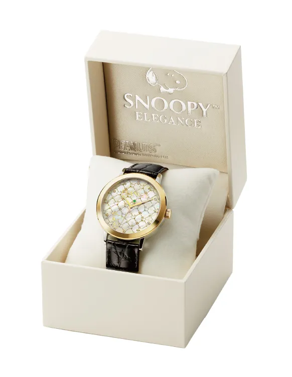 文字盤一面にひろがるモノグラム調のデザインには、誇らしげに王冠をかぶったスヌーピーとウッドストック、そしてスヌーピーの足跡が黄金色に浮かび上がります。
