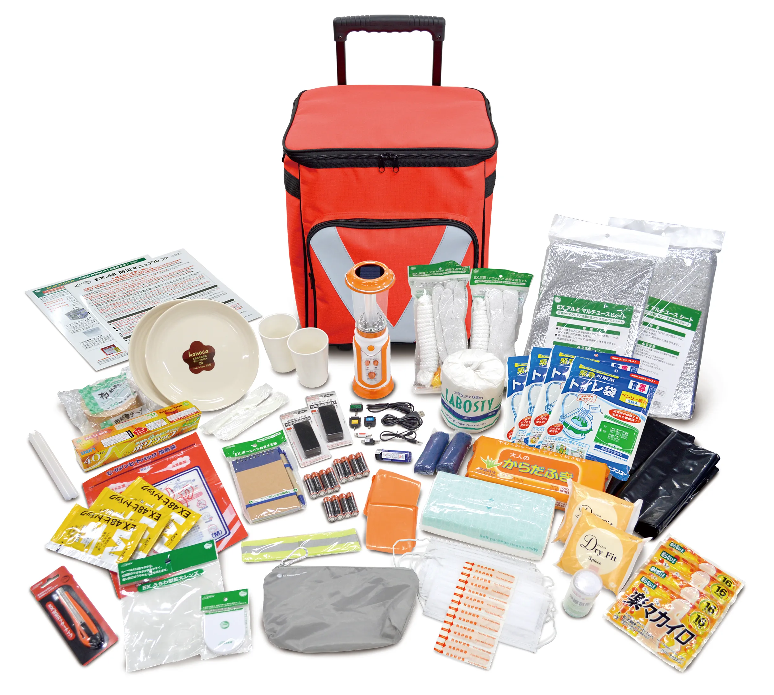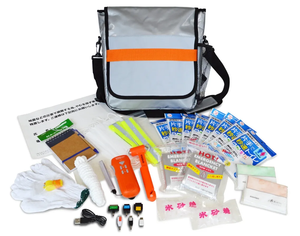 ソーラーランタン、かんたんトイレ袋、軍手、レインポンチョをはじめ、避難所での感染症対策としても需要が高まるマスクなど、いざという時の必需品34種を当社の防災士が厳選し、コンパクトに収納しました。