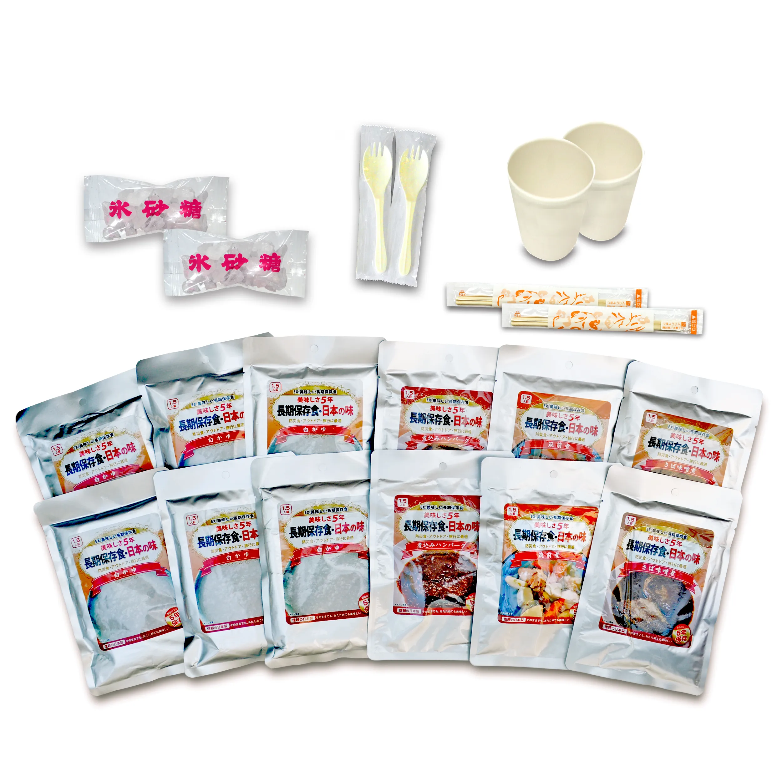 永谷園監修の製造日より5年間(お届け時点で3年以上)保存可能な長期保存食です。主食のおかゆのほか、煮込みハンバーグ、筑前煮、鯖味噌煮など保存食品とカップ、フォークスプーンなどのセットです。そのまますぐ食べても、美味しく召し上がることができ、海外旅行やアウトドアにも使える日本の味です。