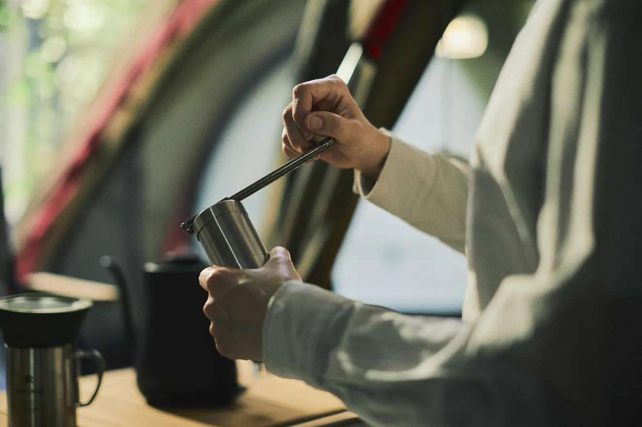 お部屋にコーヒー豆・ミル・ドリッパーのセットを設置。ご自身で豆を挽いて、挽きたての美味しいコーヒーをテラスでお召し上がりいただけます。コーヒーは京都・伏見発で販売している上質で希少なタイ産コーヒー「AKHAINOROSHI」を使用。