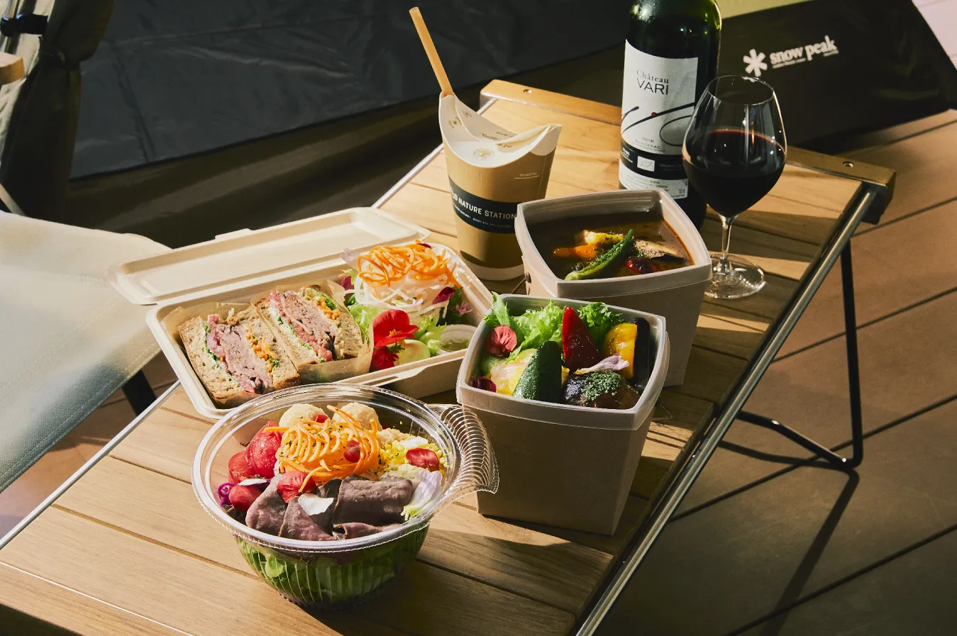 1階にて、サラダやサンドウィッチ、カレーといったお食事や、自然派ワインやクラフトビールなどのお酒を販売。ディナーもアウトドア気分に浸りながら、お食事を楽しめます。