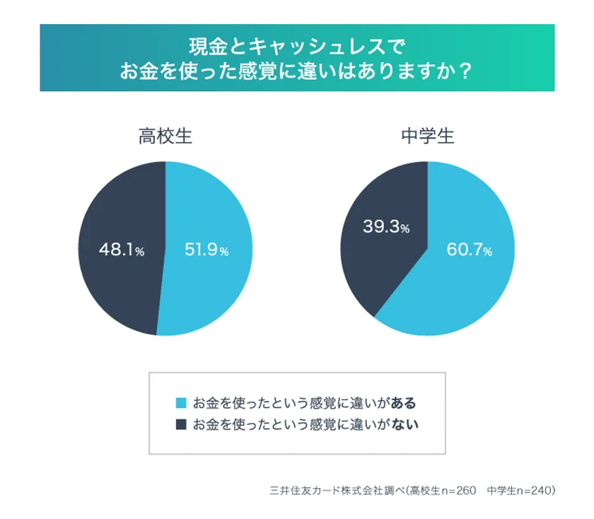 お子さんへお金をキャッシュレスで渡すデメリットとして「お金のありがたみを伝えられない」ことをあげている保護者の方が全体の2割程度いることがわかりましたが、それはもしかしたら、心配には及ばないのかもしれません。というのも中高生に対して「現金とキャッシュレスでお金を使った感覚に違いはあるか?」という質問をしたところ、中学生の60.7%が違いを感じていますが、高校生は51.9%程度でした。つまり高校生は半数程度が、現金でもキャッシュレスでもお金を使った感覚に違いはないと感じていることになります。お金のありがたみは、キャッシュレスでもちゃんと伝わっているんですね。キャッシュレス決済利用者が多い高校生の方が「お金を使った感覚の違いはない」と答えているのは、キャッシュレス決済に慣れていくうちに、違いを感じなくなっていくという傾向を見ることもできます。