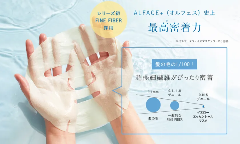(1)髪の毛の1/100の細さのFINE FIBERを使用した、オルフェス史上最高(※1)の密着力を誇る新シート「イエローシート」を採用。極やわシートが優しくお肌を包み込み、肌との隙間をつくらず美容液成分をキープします。