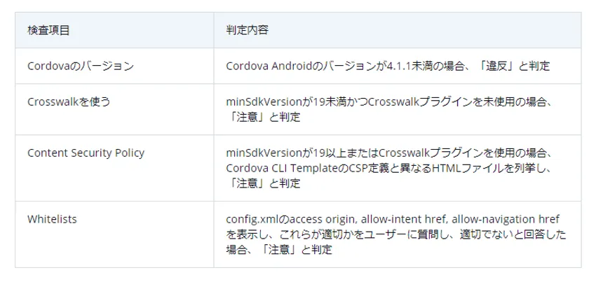 今回の連携機能により、MonacaでビルドされたAndroidアプリケーション(apkファイル)をSecure Coding Checkerで検査できるようになりました。下記の検査項目について無償で検査が可能になります(今後、無償検査範囲を拡張予定)。