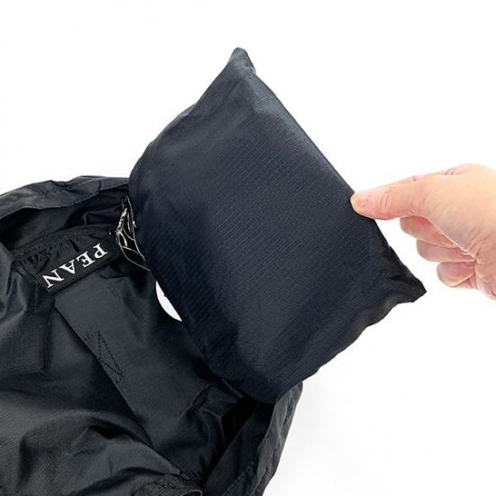 取り出したリュックはA4サイズが楽々入るちょうどいいサイズ!リュックを入れている袋はショルダーとしても使えます。リュックの内側に取り付けてポケットにも!旅先や、エコバッグとしても◎