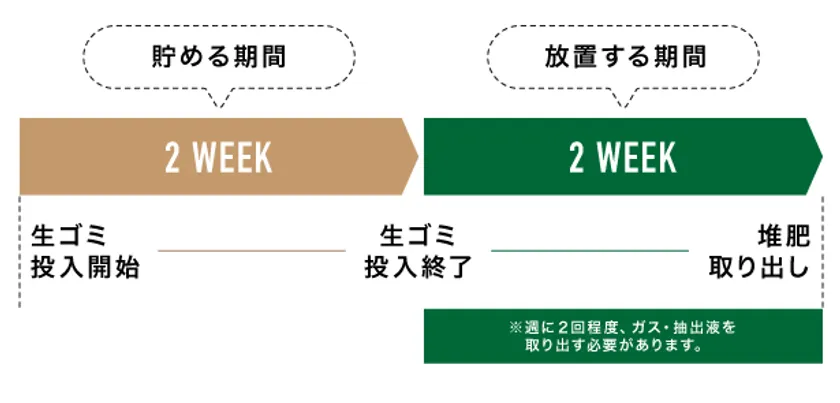 放置期間中は、週に1-2度、底部に付属のキャップを外し抽出液を取り出します。その抽出液は排水溝の浄化液や液体肥料として、2週間の放置期間を終えるとコンポストに入れた生ゴミは全て堆肥に生まれ変わります。