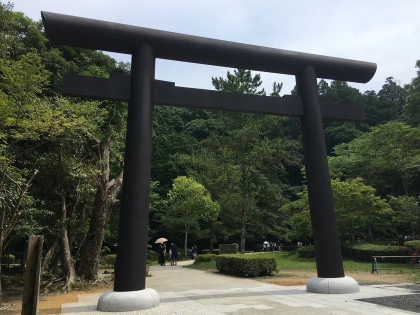 鹿島鳥居とは、その名の通り、鹿島神宮で見られる鳥居の形状です。貫は角柱で、柱の外に突き出る構造となっています。笠木は円柱で、両端が襷墨(たすきずみ)と呼ばれる斜め下に切り落とされる構造をとり、本殿へ参入する方向から見た際の左手が若干太くなっています。額束はありません。